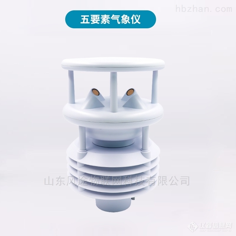 FT-WQX5型五要素微气象仪是由山东风途物联网科技有限公司研发、设计、生产的一款针对多领域气象参数进行监测的仪器。设备创新性地将气象标准五参数(环境温度、相对湿度、风速、风向、大气压力)通过一个高集成度结构来实现,可实现户外气象参数24小时连续在线监测,通过数字量通讯接口将五项参数一次性输出给用户。另外,该产品可扩展增加其它气象、环保参数(降雨量、日照辐射、AQI六参数:一氧化碳、二氧化氮、二氧化硫、臭氧、PM2.5、PM10)等。